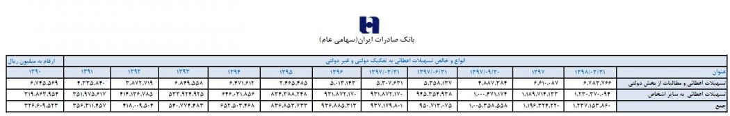 جدول منتشر شده توسط بانک صادرات ایران همچنین نشان می دهد مانده تسهیلات پرداختی این بانک در سال ۱۳۹۷ به نسبت سال قبل آن بیش از ۲۸ درصد افزایش یافته است.