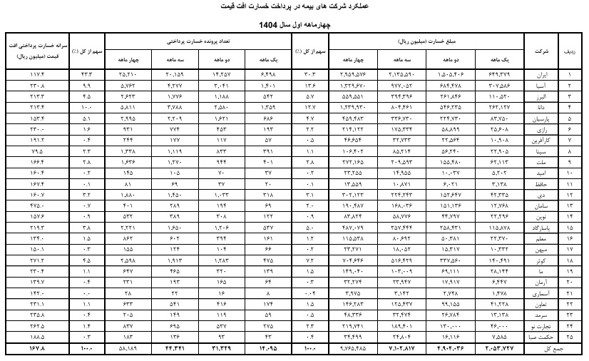 بیمه مرکزی برای نخستین بار اطلاعاتی را منتشر کرده است که نشان میدهد شرکت های بیمه در چهار ماه نخست امسال بیش از ۹۷۶۵ میلیارد ریال خسارت افت قیمت از محل بیمه نامه شخص ثالث اتومبیل پرداخت کردهاند. این اقدام در حالی انجام شده است که اجماع تقریبا کاملی علیه اجرای آن میان بیمه گران وجود دارد.
