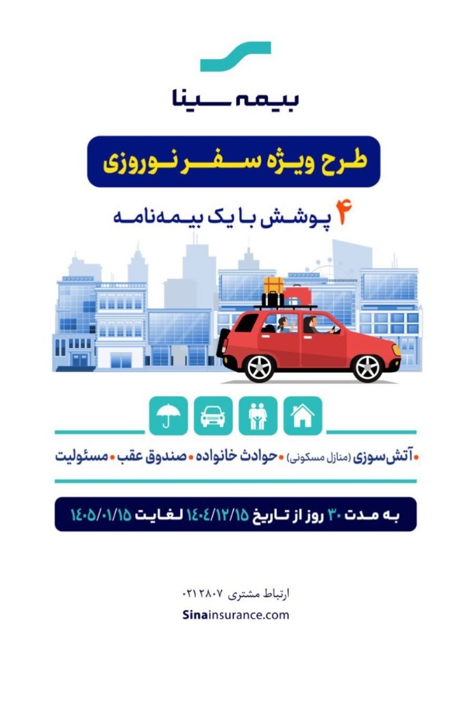 چهار پوشش در یک بیمهنامه، اقدام ویژه شرکت بیمه سینا برای عموم مردمی است که در روزهای پایان سال به سفر می روند و قصد دارند اوقات خود را بدون دردسر سپری کنند.